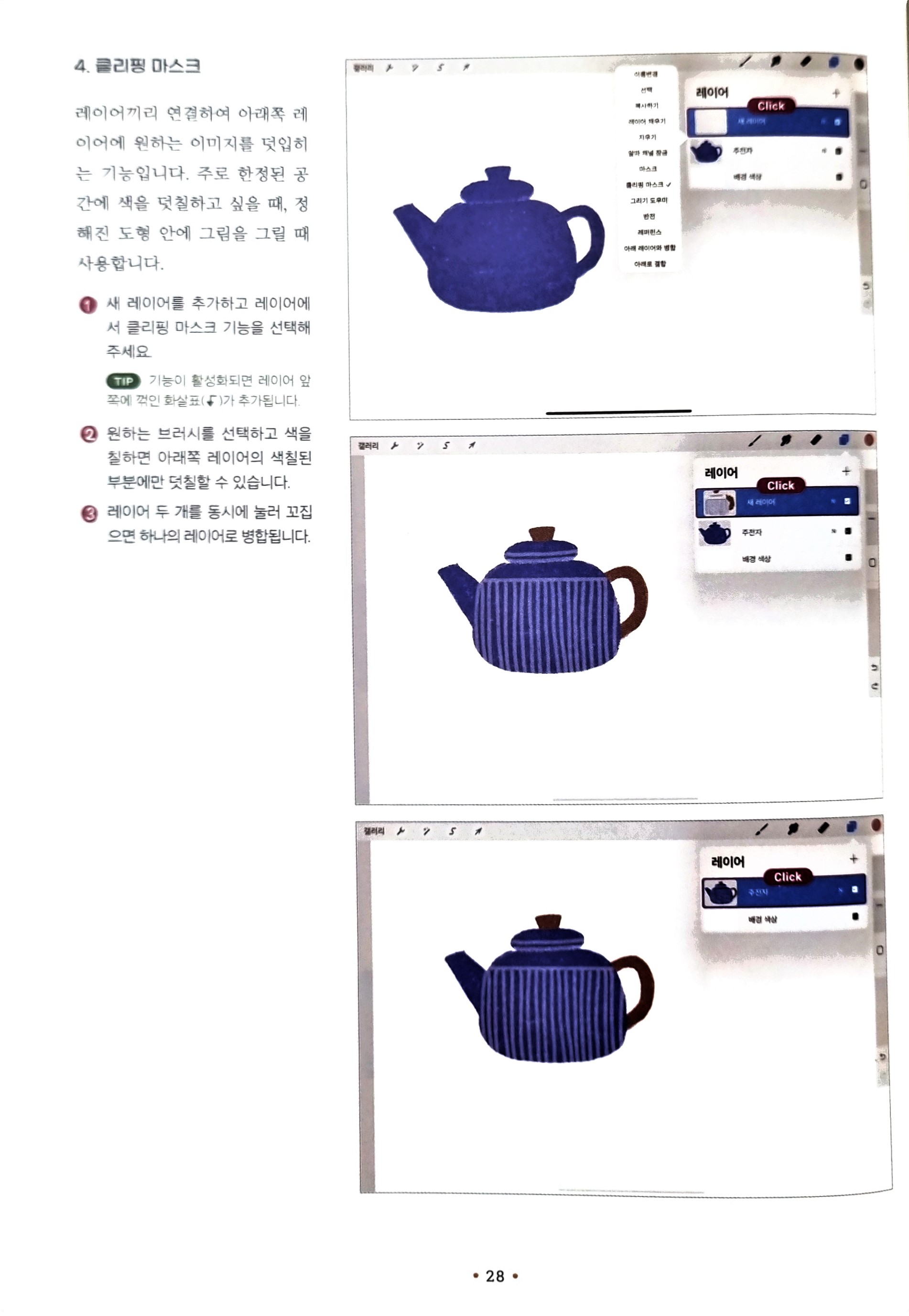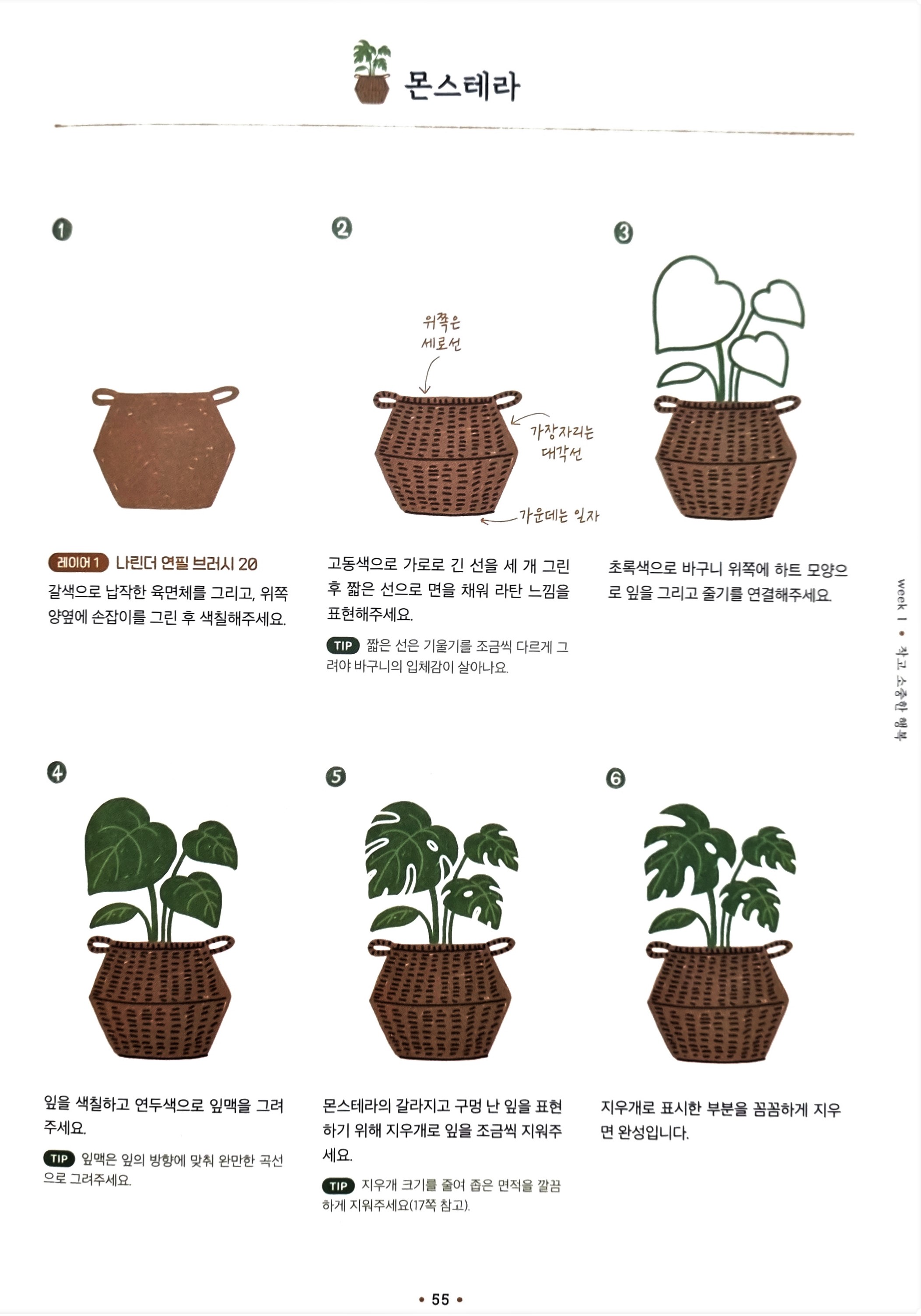 하지만 전체적으로 예쁜 그림들이 많았고, 사물을 따라 그릴 때의 형태 설명과 프로크리에이트의 기본 기능 설명이 아주 섬세하기 때문에 아이패드 드로잉을 처음 시작해보려는 분들이라면 많은 도움을 얻으실 수 있을 것 같다. 한 주에 다섯 단계씩 총 4주로 구성된 사물, 일상, 사람, 동네 풍경의 주제 구성과 추가로 제공되는 계절감이 느껴지는 일러스트까지 매력적인 그림들이 많다. 특히 다른 아이패드 드로잉북보다 건물과 배경, 종합적인 일러스트를 그려보기 좋은 구성이므로, 레이어 사용이 익숙하신 분들이시라면 자신만의 방식으로 같은 결과물을 그려내는 데에 도전해보시는 것도 좋겠다.
