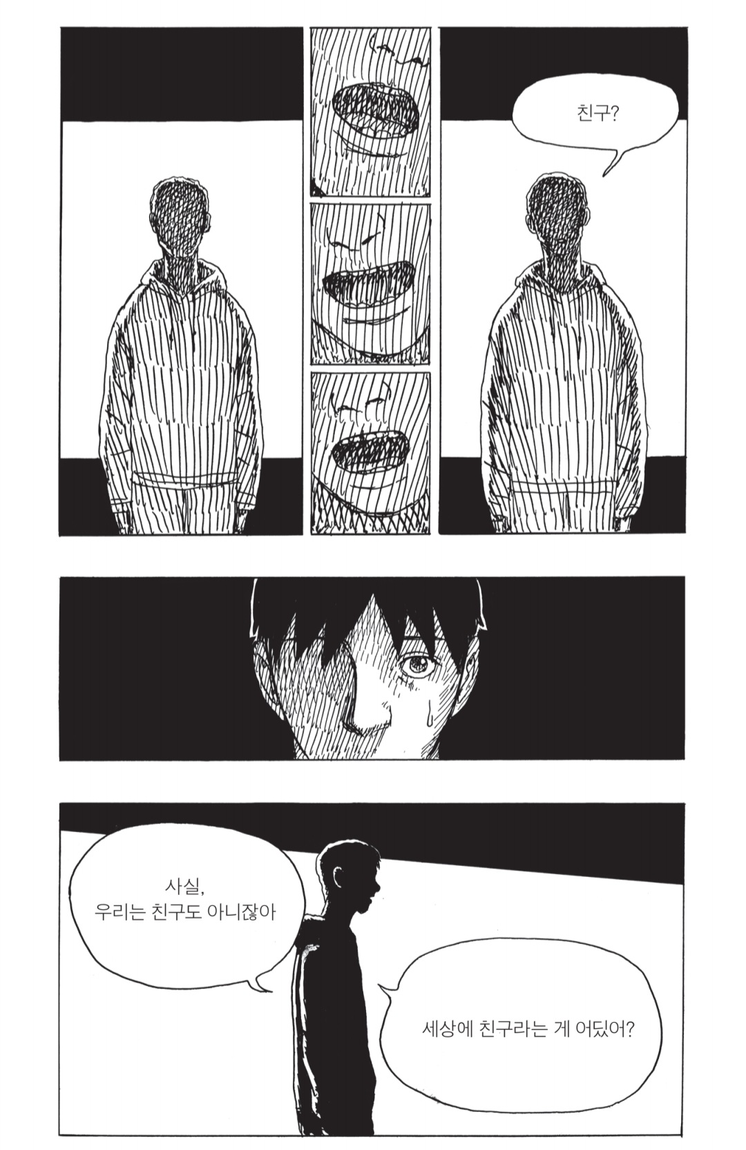 그런 생각을 하던 즈음에, 일종의 고정된 틀이라 할 수 있는 그림을 접하니 잡생각들이 조금 사그라들었다. 저자가 어떤 형태로 작업하는지는 확인하지 못했으나, 수작업처럼 보이는 펜선들이 무척 매력적이었다. 이 시리즈 전체의 표지와, 한 권을 담당하고 있는 <친구의 부름>을 작업하신 것으로 알고 있다. 저자가 표현하고 싶어 한 익명 속의 죄, 인지하지 못한 부채감과 죄의식, 순간의 가벼움 등이 깊게 다가오는 단편이다.