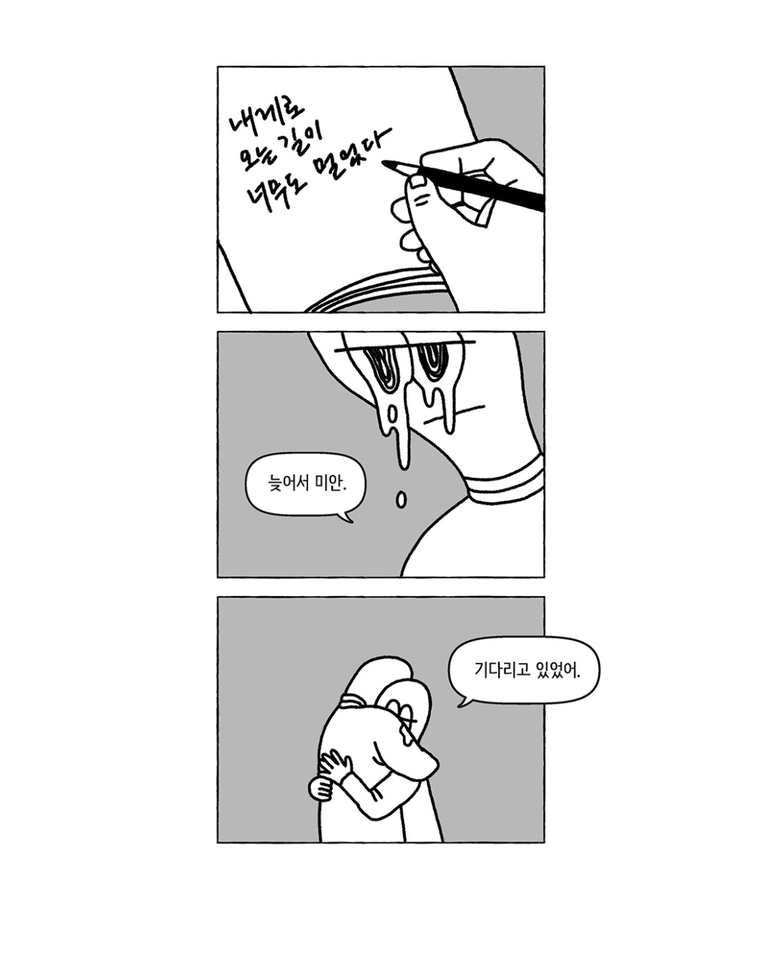 - 우는 내 얼굴을 보며 마음속의 내가 슬퍼하고 있었다. 흐르는 눈물을 닦고 나를 달랬다. 미안. 앞으로는 자신의 말을 더 많이 듣고, 존중하고, 사랑해 줄게.