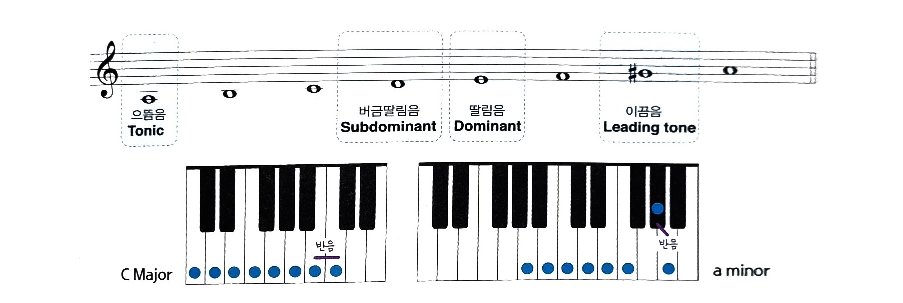 - 하지만 단조(minor)에서는 일곱 번째와 여덟 번째가 반음 관계가 아닙니다. 따라서 이끔음 역할을 부여하기 위해 #(올림표)을 붙여 반음 관계로 만듭니다.