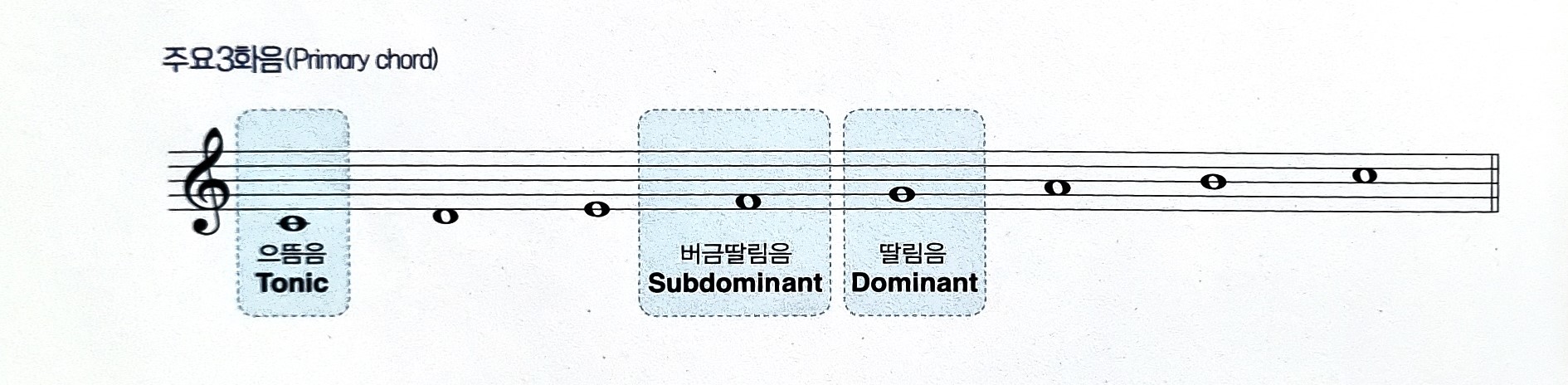 - 자, 이 음들에 세 번째, 다섯 번째 음을 추가해 화음을 만들어봅시다. 으뜸화음(Tonic triad), 딸림화음(Dominant triad), 버금딸림화음(Subdominant triad)이 됩니다. 이 3화음을 주요3화음(Primary chord)이라고 합니다.곡에서 중요한 화음인 만큼 많이 등장하고, 중요한 역할을 합니다.