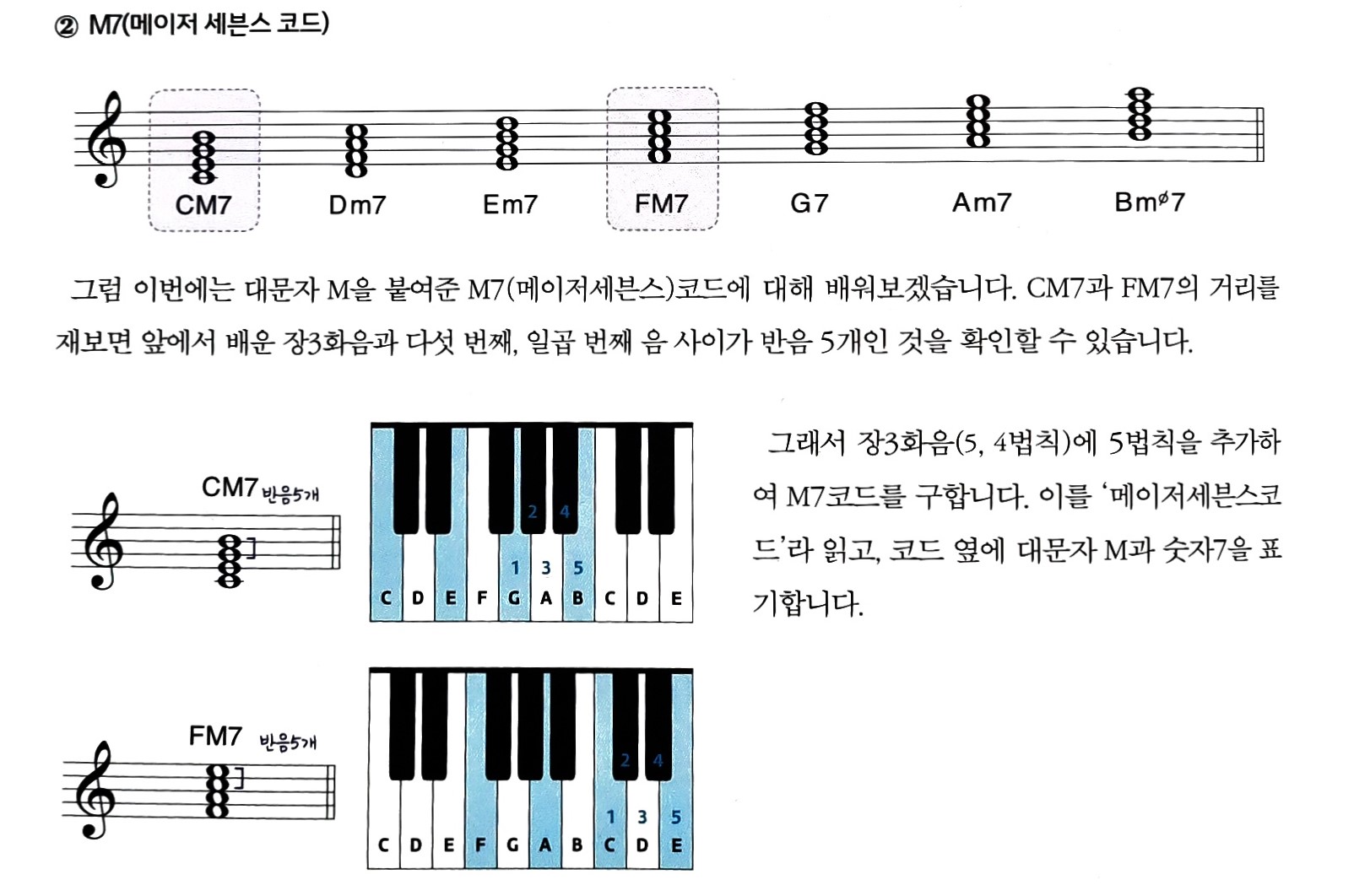 - 그럼 이번에는 대문자 M을 붙여준 M7(메이저세븐스)코드에 대해 배워보겠습니다. CM7과 FM7의 거리를 재보면 앞에서 배운 장3화음과 다섯 번째, 일곱 번째 음 사이가 반음 5개인 것을 확인할 수 있습니다. 그래서 장3화음(5, 4법칙)에 5법칙을 추가하여 M7코드를 구합니다. 이를 '메이저세븐스코드'라 읽고, 코드 옆에 대문자 M과 숫자7을 표기합니다.