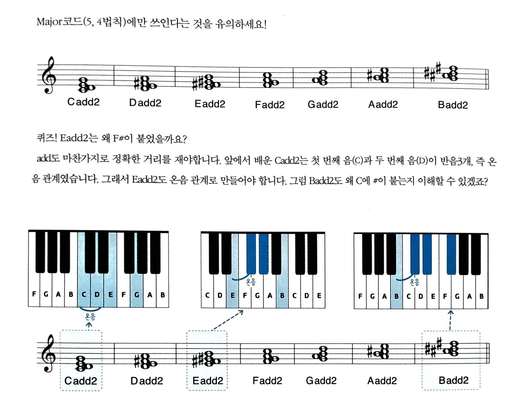 - add도 마찬가지로 정확한 거리를 재야 합니다. 앞에서 배운 C add2는 첫 번째 음(C)과 두 번째 음(D)이 반음 3개, 즉 온음 관계였습니다. 그래서 E add2도 온음 관계로 만들어야 합니다. 그럼 B add2도 왜 C에 #이 붙는지 이해할 수 있겠죠?