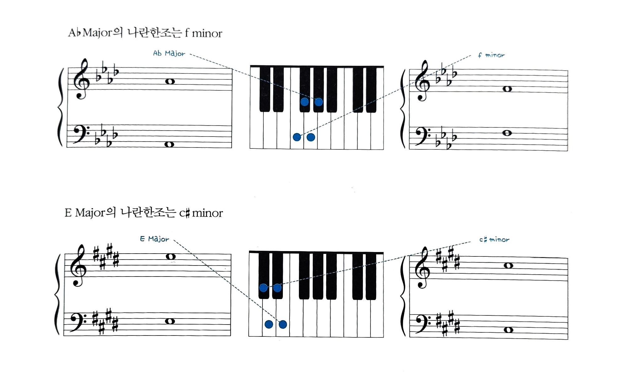 - 장조와 단조는 짝을 이루어 하나의 조표를 갖게 되는데요. 이렇게 같은 조표를 갖는 장조와 단조를 나란한조(Relative key)라고 합니다. 이 둘 는 반음 4개(단3도)로 이루어져 있습니다. C Major의 나란한조는 a minor. 그럼 a minor의 나란한조는 무엇일까요? C Major입니다!