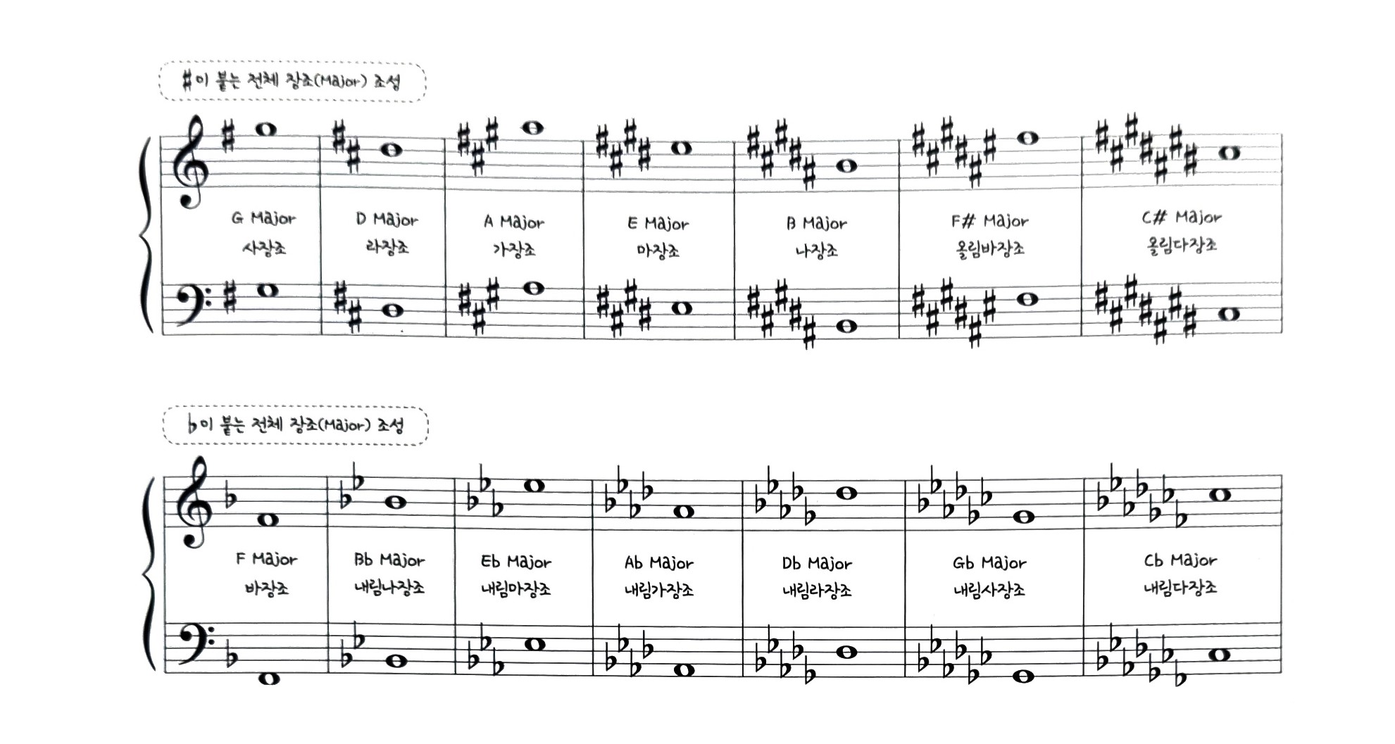 - b(내림표)은 마지막에 붙은 b에서 4개 내려서 조성을 구합니다. 그림에서 첫 번째 마디는 시(B)b에서 4개 내려가면, 시, 라, 솔, 파! 파(F)가 주인공인 F Major가 조성이 됩니다. 그다음 마디는 마지막 붙은 미(E)b에서 4개 내려가면, 미, 레, 도, 시. 시(B)! 하지만 조표에 시(B)b이 붙어 있기 때문에 시(B)b이 주인공인 Bb Major가 조성이 됩니다.