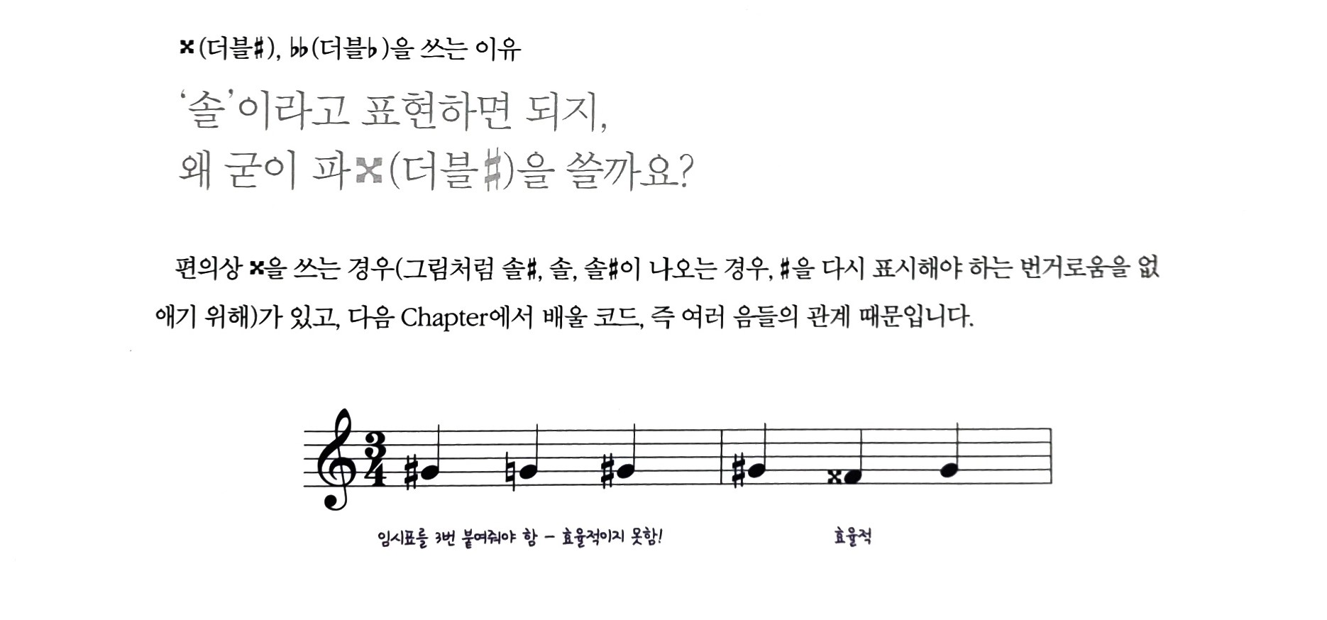- x(더블), bb(더블)을 쓰는 이유 : '솔'이라고 표현하면 되지, 왜 굳이 파x(더블)을 쓸까요? 편의상 x을 쓰는 경우(그림처럼 솔, 솔, 솔이 나오는 경우, #을 다시 표시해야 하는 번거로움을 없애기 위해)가 있고, 다음 Chapter에서 배울 코드, 즉 여러 음들의 관계 때문입니다.