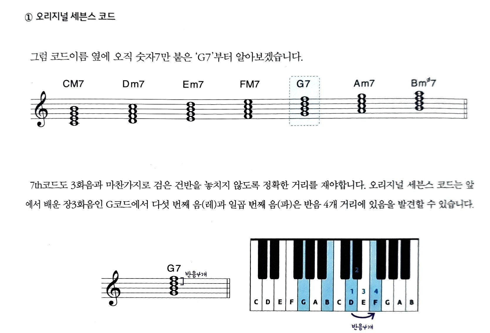 - 7th드 3화음과 마찬가지로 검은 건반을 놓치지 않도록 정확한 거리를 재야 합니다. 오리지널 세븐스 코드는 앞에서 배운 장3화음인 G코드에서 다섯 번째 음(레)과 일곱 번째 음(파)은 반음 4개 거리에 있음을 발견할 수 있습니다. 앞에서 배운 장3화음 코드(5, 4법칙)에 4법칙을 추가해 5, 4, 4 법칙을 사용하여 구할 수 있습니다. 'G 세븐스 코드'라고 읽고 코드 옆에 숫자 표기합니다.