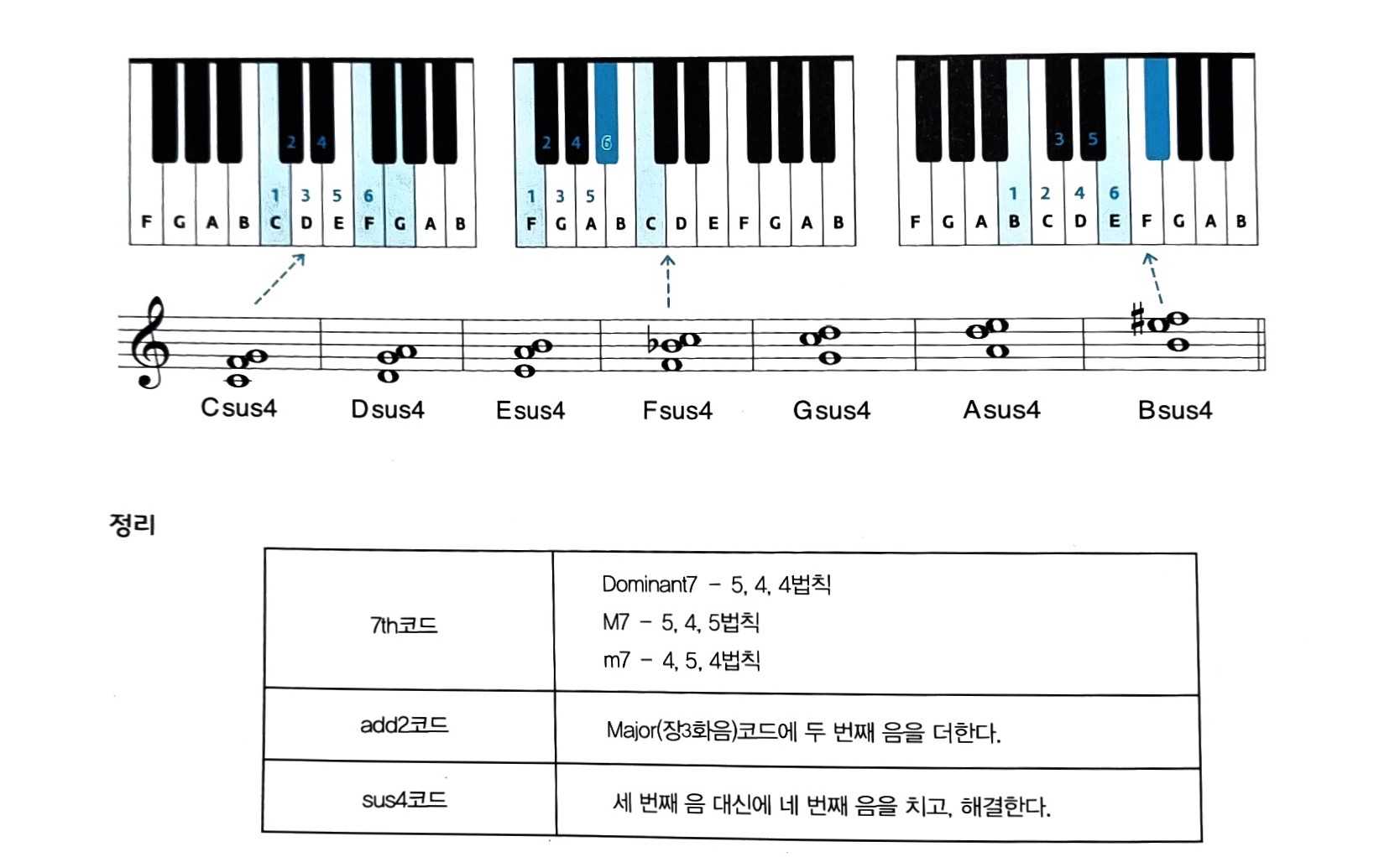 - sus4는 sus suspended의 약자로 세 번째 음 대신에 네 번째 음을 쳐줌으로써 긴장감을 주는 코드입니다. sus4는 긴장감이 있는 코드이기 때문에 루트음의 장3화음(Major Triad)이나 루트음의 7화음으로 해결하려는 성질이 있습니다.(ex. C sus4-C, C sus4-C7)