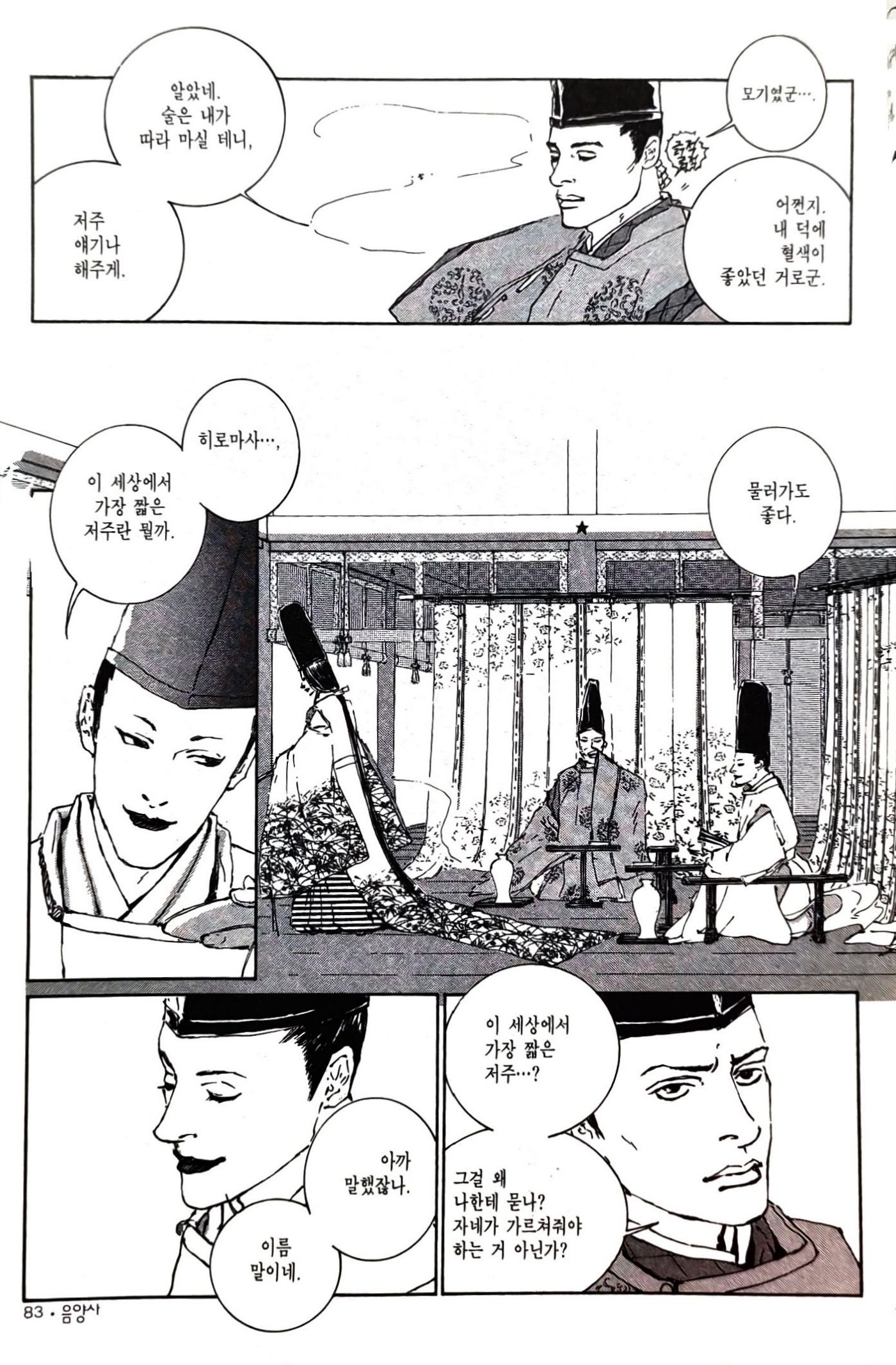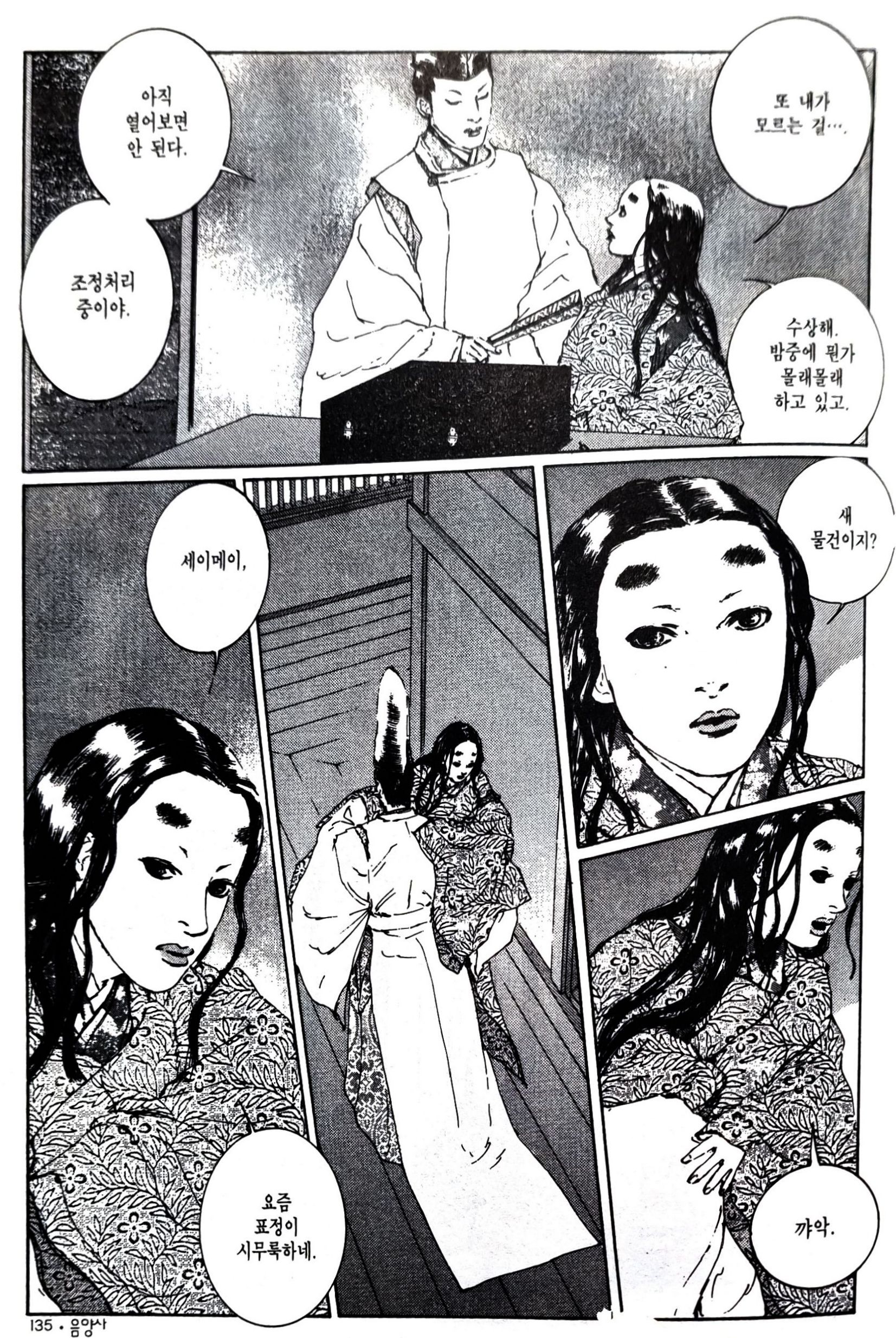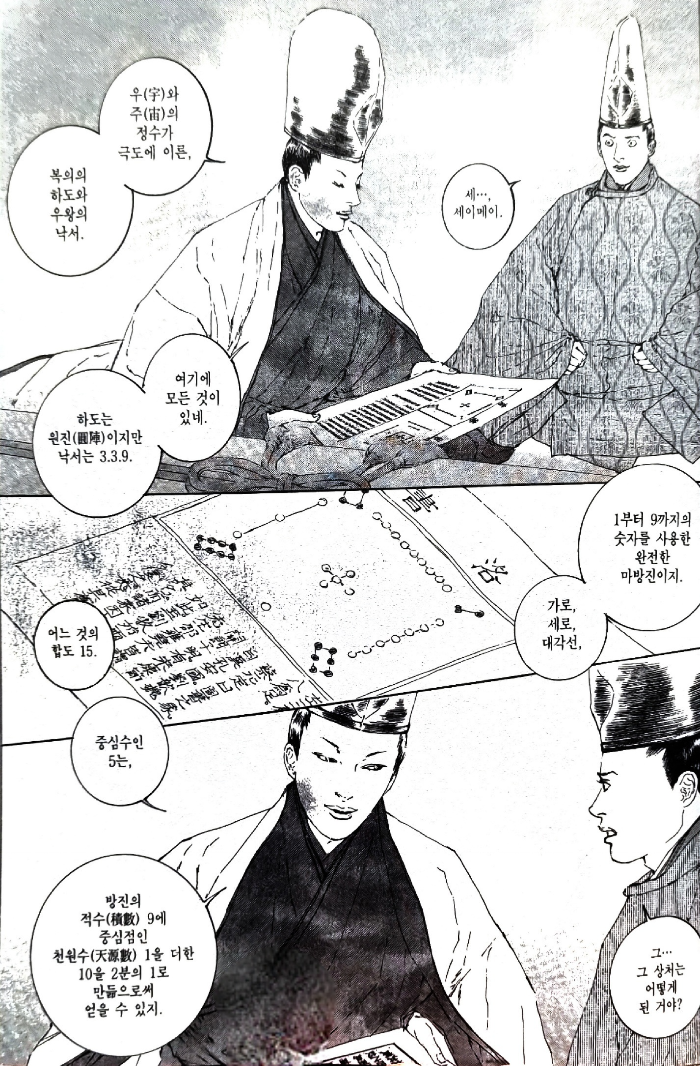 전체를 읽은 후 하나의 글로 쓰고자 했기에 읽는 데도, 정리하는 데도 시간이 꽤 오래 걸렸다. 몇 번이고 다시 들춰보며 어떤 때에는 작화에, 어떤 때에는 대사에 감탄하기도 하고 당황하기도 하며 읽었다. 바쿠의 <음양사>를 다시 읽은 후에 이야기 하는 것이 더 적절하겠지만, 바쿠 쪽이 좀더 일본 자체의 영묘함과 세이메이와 히로마사 간의 관계에 초점을 맞춘 느낌이다. 레이코의 <음양사>는 세이메이라는 인물의 역사적 사실을 기반으로 하되, '진리'에는 동서양의 차이가 없으며 모든 것은 하나로 귀결된다는 메시지가 강조된다. 그래서인지 바쿠 쪽에는 등장하지 않는 '마쿠즈'라는 캐릭터가 등장하는데, 아무래도 미들필라와 여성성 원리를 엮기 위해서는 주요한 여성 인물이 필요했기 때문일 것이다. 이에 대해서는 독자마다의 취향에 따라 호불호가 갈릴 수 있겠다.