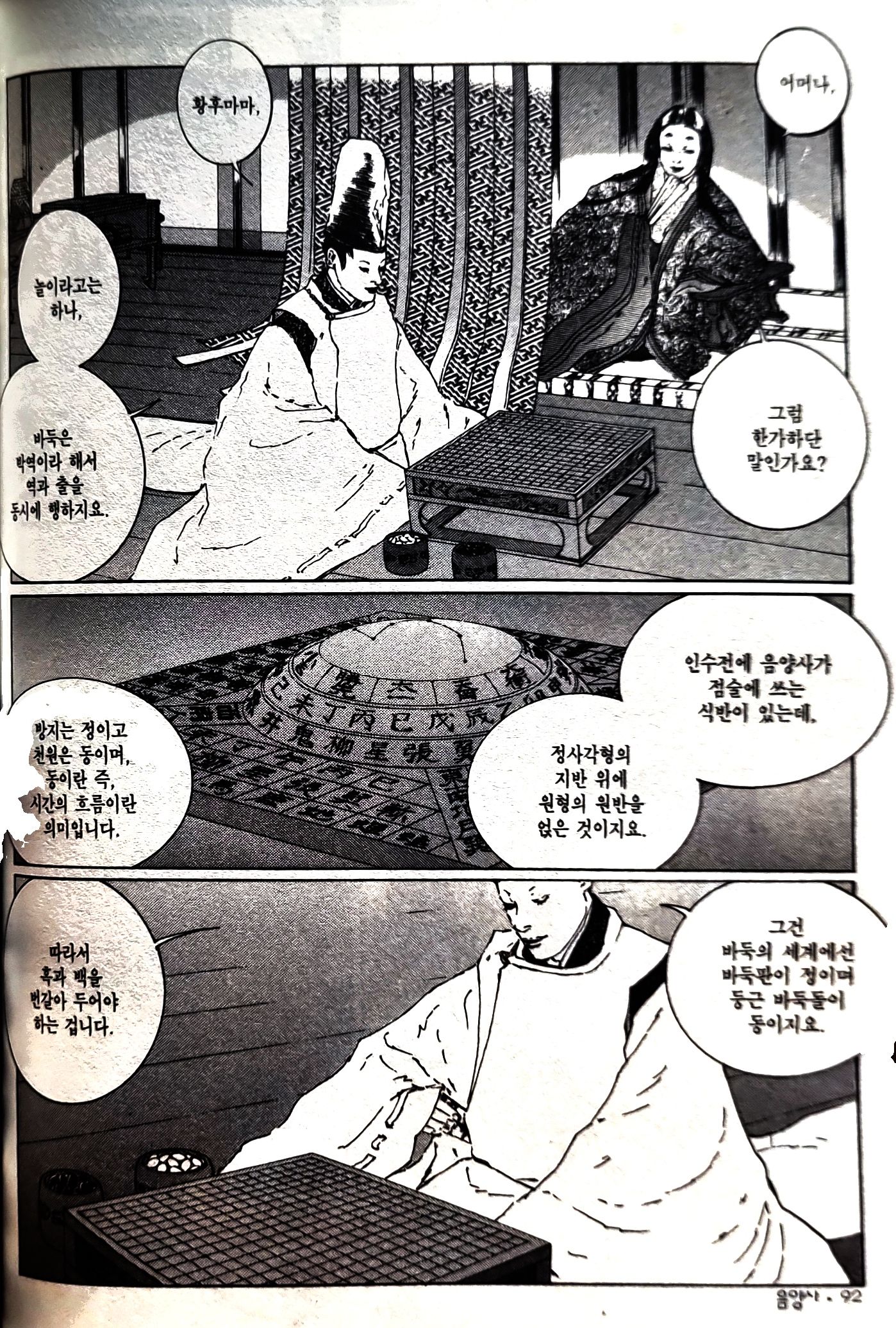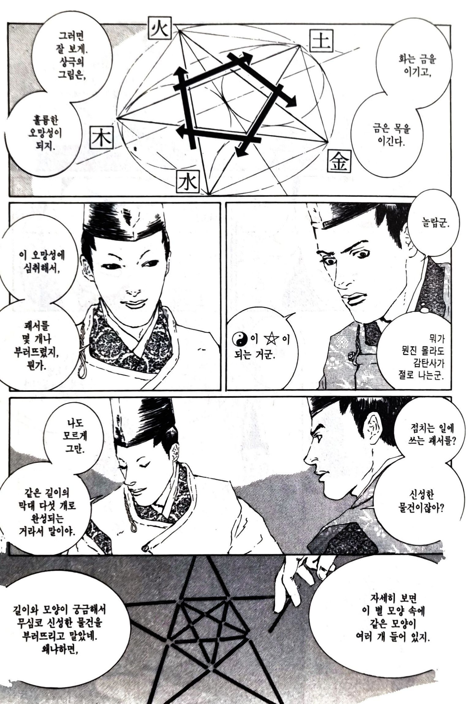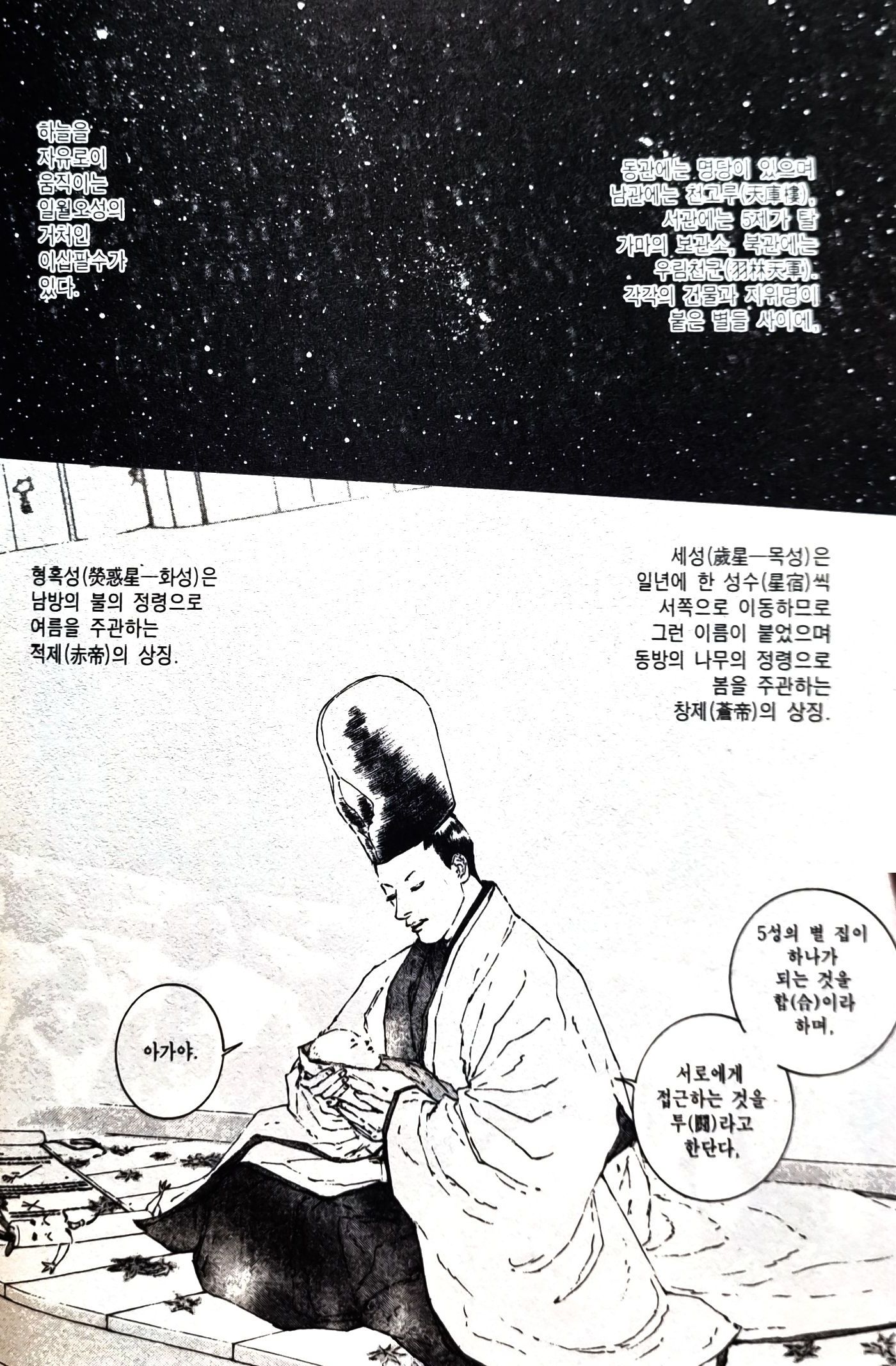 - '반상에 하늘을 편다. 자미(紫微), 좌원우원(左垣右垣), 천주(天柱), 오제(五帝), 북두(北斗)... 전에도 사각사계에 결계를 쳤었어...'