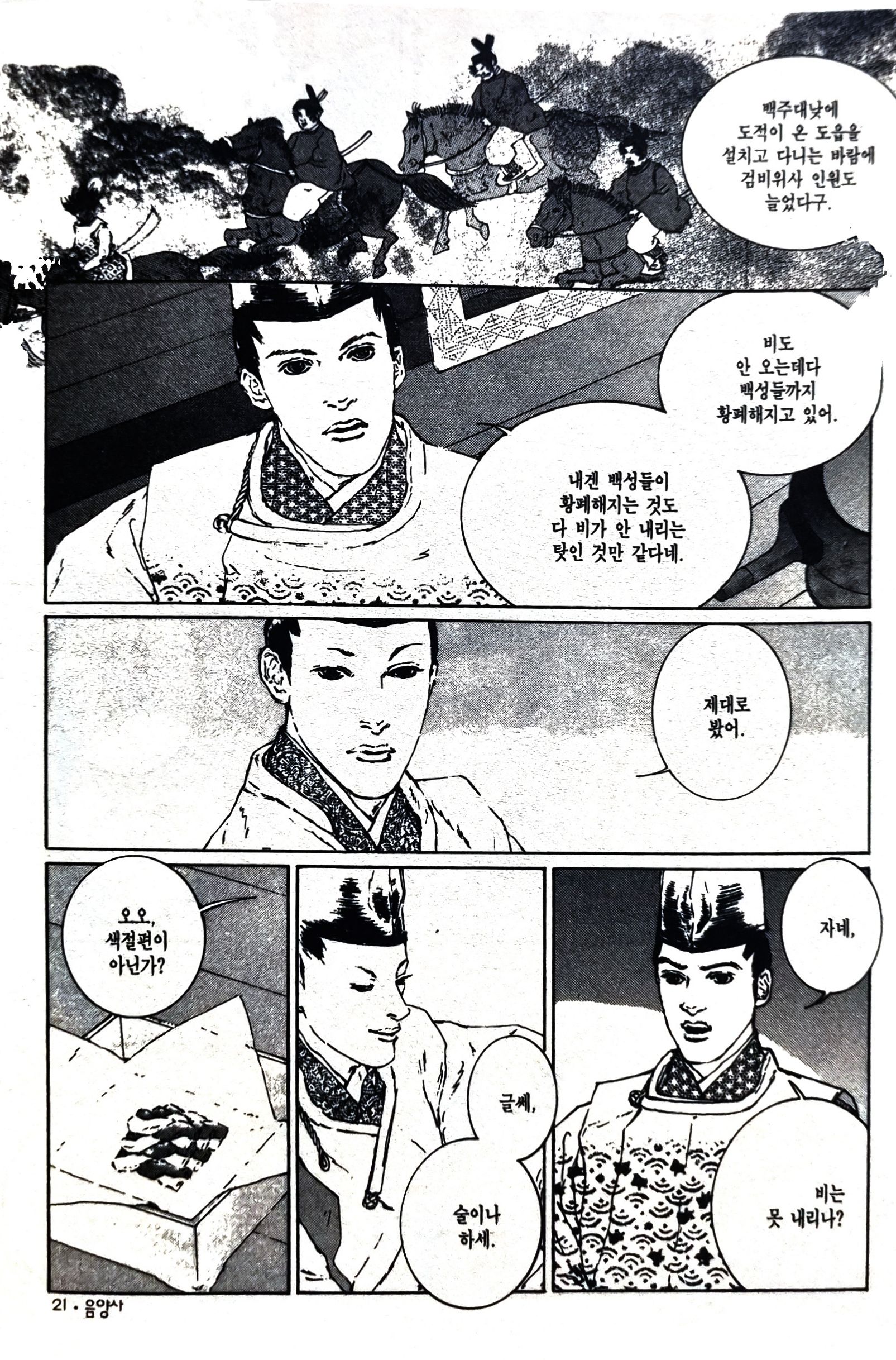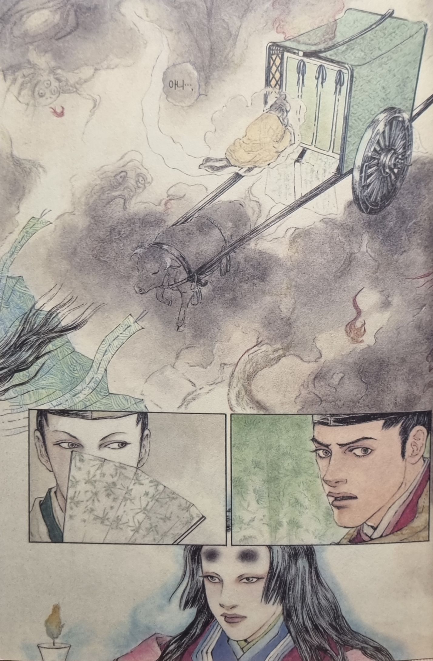 개인적으로는 영검 수리 이후부터의 작품은 완전히 오카노 레이코 만의 <음양사>로 보아야 한다고 생각한다. 10권에서 세이메이가 히로마사에게 '아마는 자네와 내가 춤을 춰도 상관없이 작동한다'는 말을 하는데, 이 대사가 딱 들어맞는다. 굳이 세이메이가 아니고 히로마사가 아니어도 되는 이야기였다. 아, 의미 없는 이야기라는 말은 아니다. 오히려 담겨 있는 메시지의 보편성이 강해지면서 그것을 담아내는 캐릭터들의 개별적 특성보다 상징성이 중요해졌다는 말이다. 다만 너무 넓게 연결하고 싶어했던 것은 아닌가 싶기도 하다. (본편 전개보다는 부록으로 담아내는 것도 좋지 않았을까.)