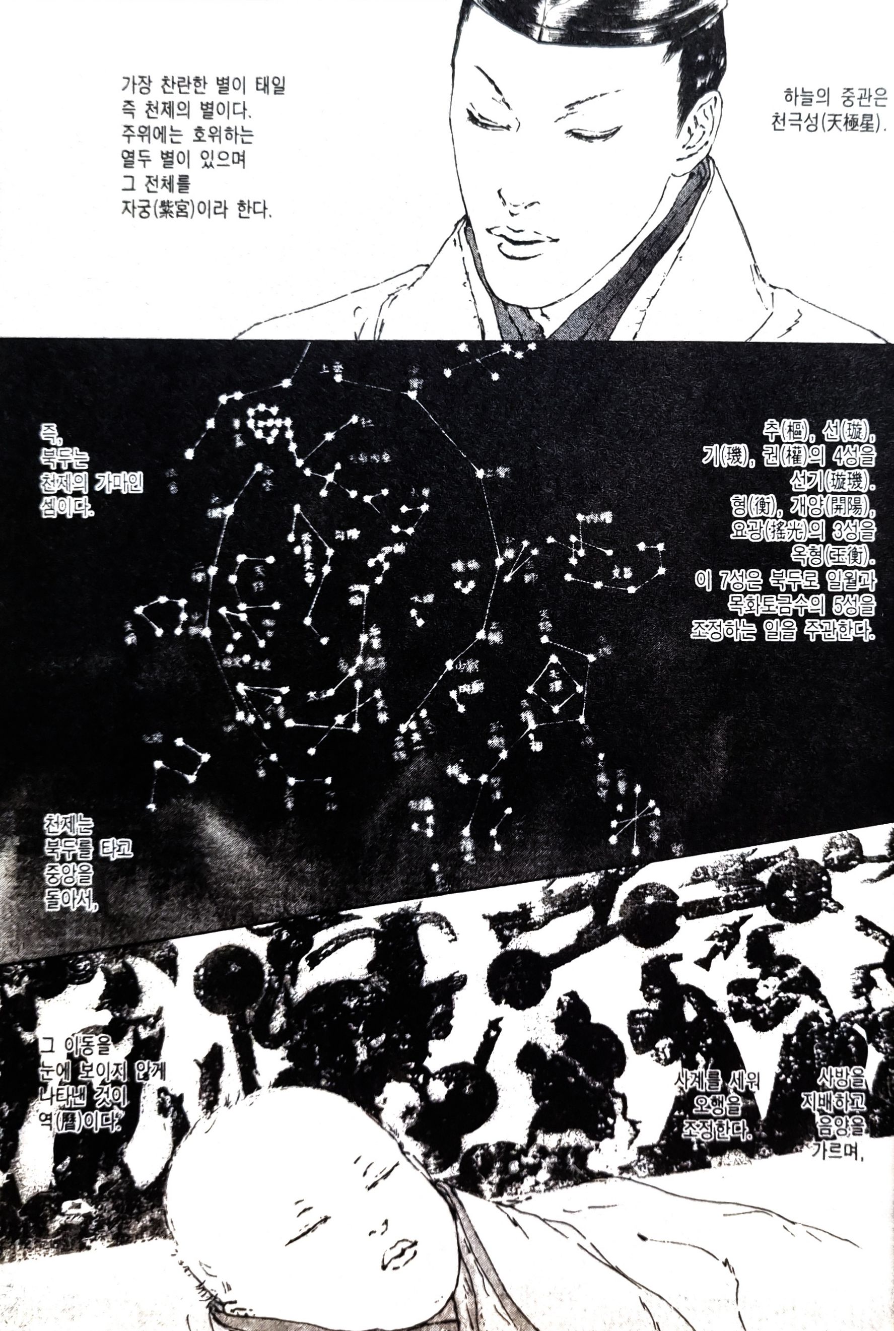- '하늘의 중궁전은 천극성. 가장 밝은 별이 태일 천제를 뜻한다. 추(樞), 선(璇), 기(璣), 권(權)의 네 별을 선기(璇璣). 형(衡), 개양(開陽), 요광(搖光)의 세 별을 옥형(玉衡).'