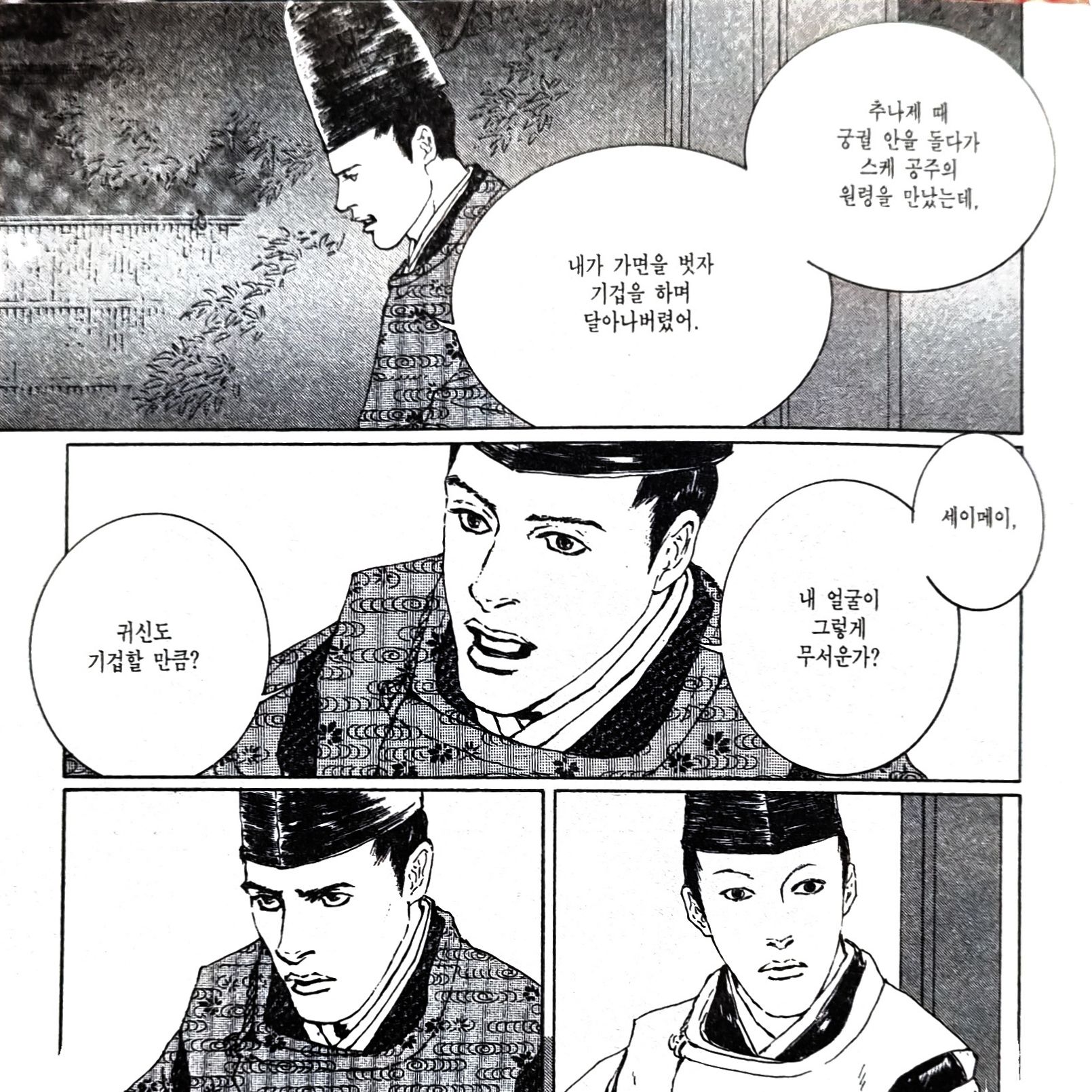 "정말 진짜 세이메이야? 자네 집에선 언제나 희한한 여자나 쥐 같은 게 나오니, 자네 얼굴을 한 자가 나와도 단박에 자네라고 믿을 수가 없어."