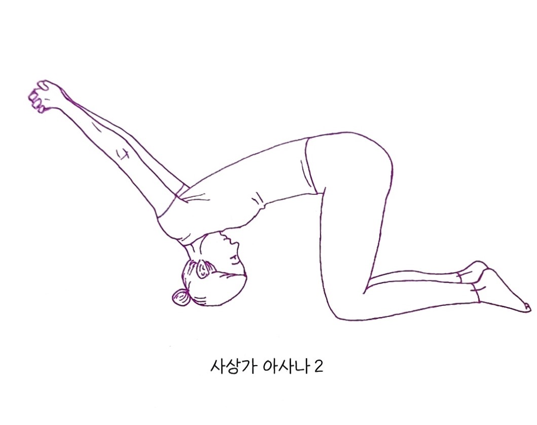 - 사상가 아사나는 수업시간에 많은 사람들이 선호하는 자세입니다. 머리의 지끈거림이나 어깨가 뻐근한 증상이 개선되고, 얼굴의 부기가 빠졌다는 증언들이 잇따릅니다. 그러나 처음 해보면 머리가 눌리는 낯선 느낌에 놀랄 수도 있어요. 반복해서 수련하다 보면 동작을 할 때의 통증은 점차 줄어듭니다. 또 두 번째 자세에서 팔이 잘 올라가지 않거나 뒤로 손깍지를 하는 게 힘든 분들도 있어요. 그럴 때는 혹시 목이나 어깨에 다른 이상이 없는지 점검해 보는 게 좋습니다.