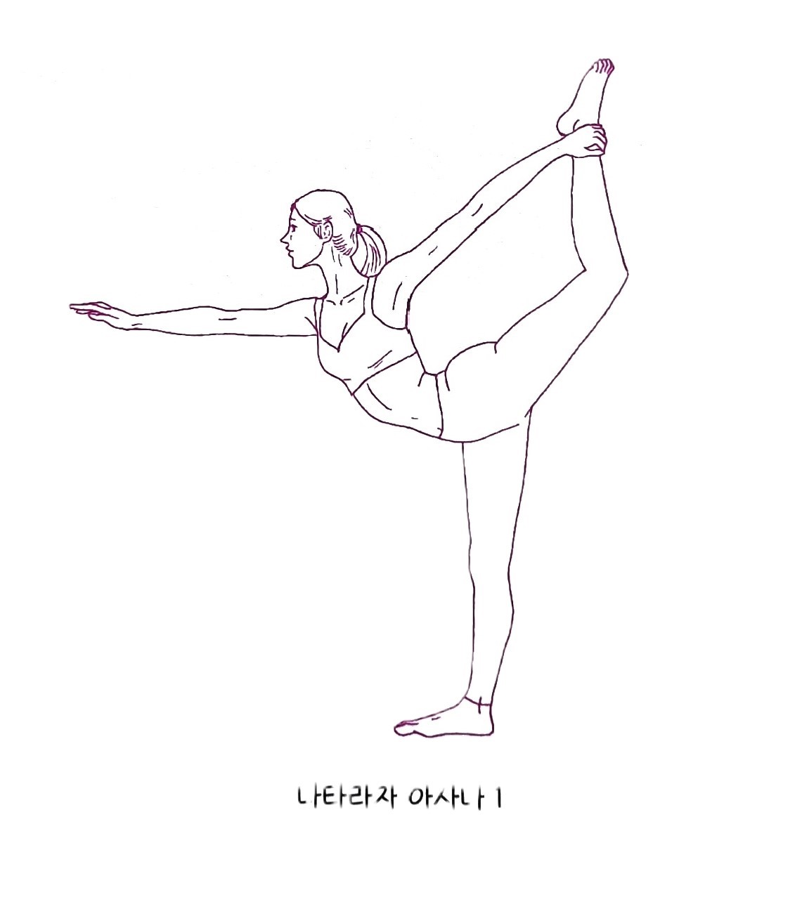 - 기본 선 자세(타다 아사나)에서 시작합니다. 오른발에 의식을 두고 왼 무릎을 굽혀 왼손으로 발날이나 발목을 잡습니다. 몸을 앞으로 기울임과 동시에 다리를 뒤로 높이 들어 올립니다. 충분히 호흡하며 왼 다리 앞쪽, 장요근, 상체앞면을 늘어나게 합니다. 오른팔은 앞으로 쭉 뻗어서 한 군데에 시선을 두고 마음을 모아봅니다.