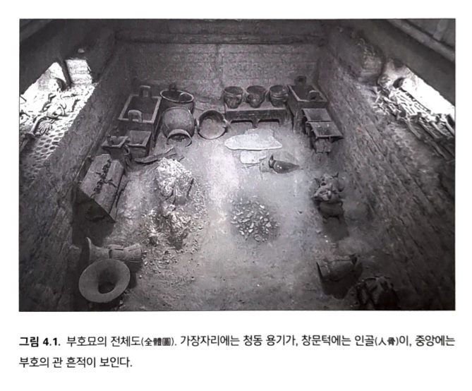 - 살아 있는 사람과 죽은 사람의 관계에 결정적이었던 청동 용기에는 죽은 사람을 기리는 의례용 식사를 위한 음식과 음료를 담았고, 매우 정교하고 아름다웠다. 그 외에도 다수의 청동 무기, 청동 종(鐘), 청동 칼과 청동거울 4개, 청동호랑이 조각상 4개가 있었다. 남쪽 연안 해역에 서식하는 개오지 조개껍데기는 거의 7,000개가 있었다. 뼈로 만든 500개의 머리핀은 왕실 머리장식과 외모를 꾸미는 일이 본질적으로 얼마나 정교했는지를 시사한다. 석재 물건 및 755 개의 옥과 함께 상감(象嵌) 세공한 상아도 발견되었다. 일부는 동시대에 정교하게 조각한 공예품이었고 나머지 일부는 묻힐 당시 이미 수백 년이 지난 것으로, 아마도 가보로서 보관되었을 것으로 추정된다. 관아래 구덩이에는 부호가 죽을 때 희생된 개 여섯 마리가 있었고, ...
