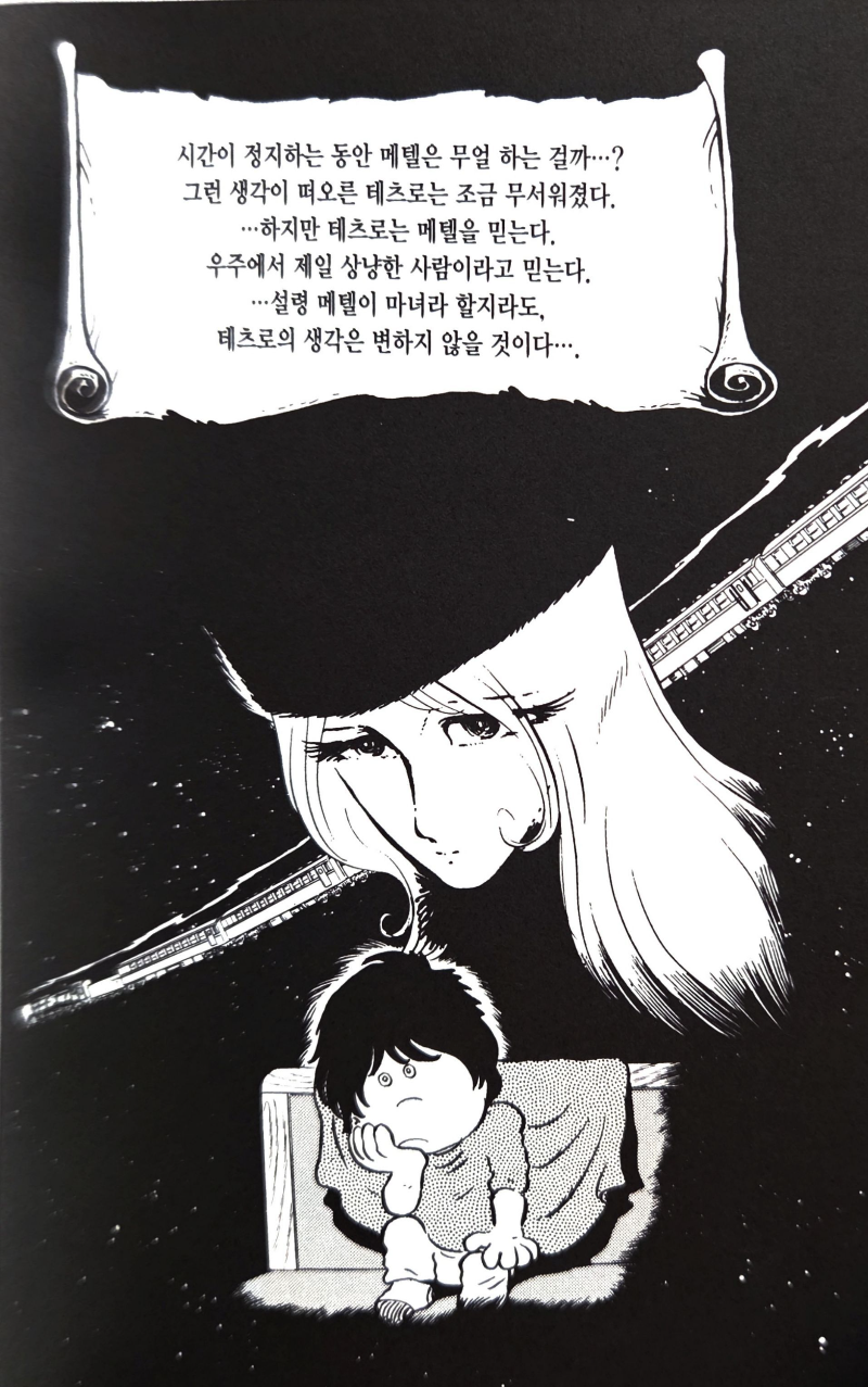 - 시간이 정지하는 동안 메텔은 무얼 하는 걸까...? 그런 생각이 떠오른 테츠로는 조금 무서워졌다. ...하지만 테츠로는 메텔을 믿는다. 우주에서 제일 상냥한 사람이라고 믿는다. ... 설령 메텔이 마녀라 할지라도. 테츠로의 생각은 변하지 않을 것이다.