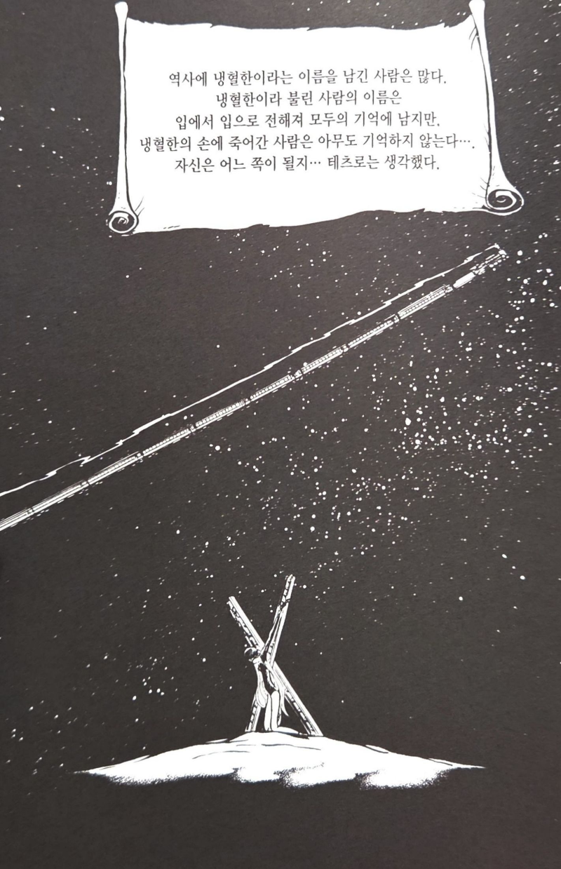 - 역사에 냉혈한이라는 이름을 남긴 사람은 많다. 냉혈한이라 불린 사람의 이름은 입에서 입으로 전해져 모두의 기억에 남지만, 냉혈한의 손에 죽어간 사람은 아무도 기억하지 않는다... 자신은 어느 쪽이 될지... 테츠로는 생각했다.
