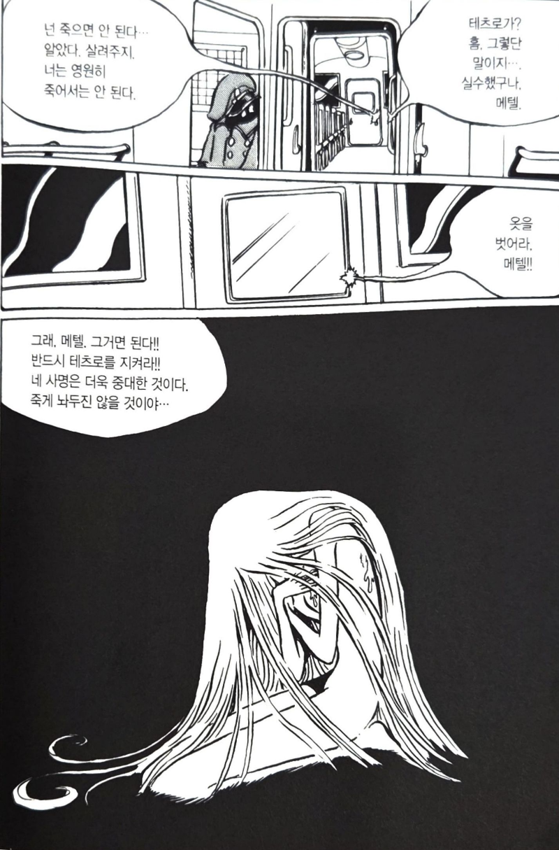 "응, 잘 알던 사람의 마음이야... 아주 잘 알던 사람의... 테츠로 같았던 사람의... 마음이야... 그 사람은 꿈과 희망을 품은 젊은이를 죽이고 괴롭히는 게 삶의 낙이었어... 내가 알던 시절의 그 사람은... 옛날 그 사람은 꿈과 희망이 가득 넘치던... 젊은이였지... 기계 육체를 얻고... 그 사람은... 나와 여행하는 젊은이나 많은 인간을 죽였어... 나는 그에게 죽은, 많은 젊은이를... 남자를 알아..."