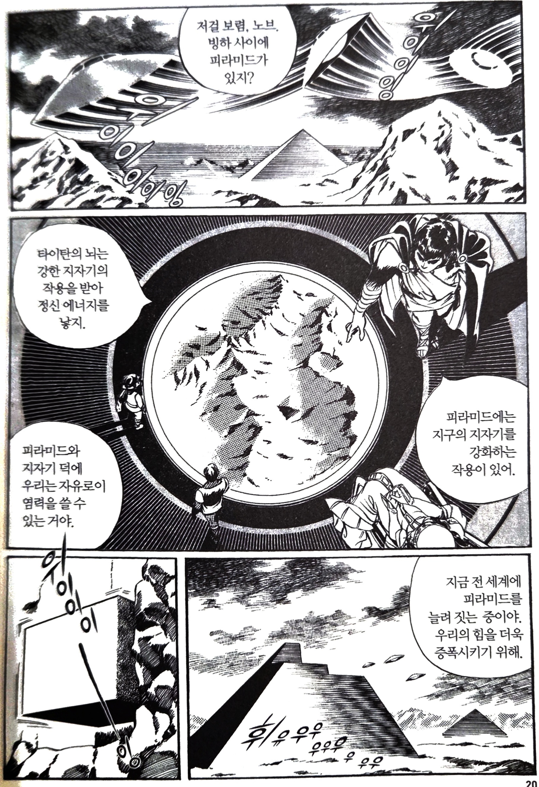 - "저걸 보렴, 노브. 빙하 사이에 피라미드가 있지? 타이탄의 뇌는 강한 지자기의 작용을 받아 정신 에너지를 낳지. 피라미드에는 지구의 지자기를 강화하는 작용이 있어. 피라미드와 지자기 덕에 우리는 자유로이 염력을 쓸 수 있는 거야. 지금 전 세계에 피라미드를 늘려 짓는 중이야. 우리의 힘을 더욱 증폭시키기 위해."