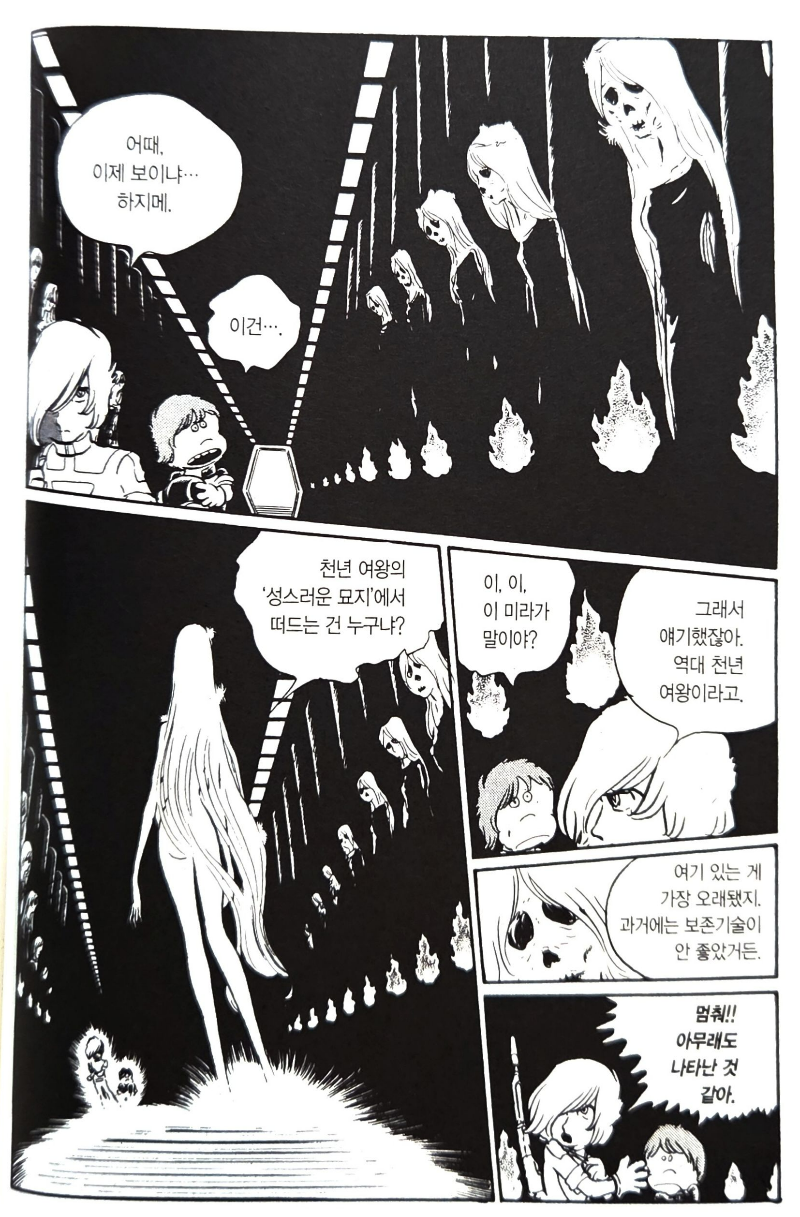 <1000년 여왕>은 일본의 고대 설화와 현대적 감성, 그리고 지구 공동설과 달 같은 다양한 요소들을 잘 녹여낸 작품이다. <은하철도 999>와 완전히 같은 세계관이라고 보긴 어렵지만, 주인공 하지메와 야요이의 외양부터 프로메슘이라는 이름까지- 어느 정도 비슷한 결을 공유하고 있다.