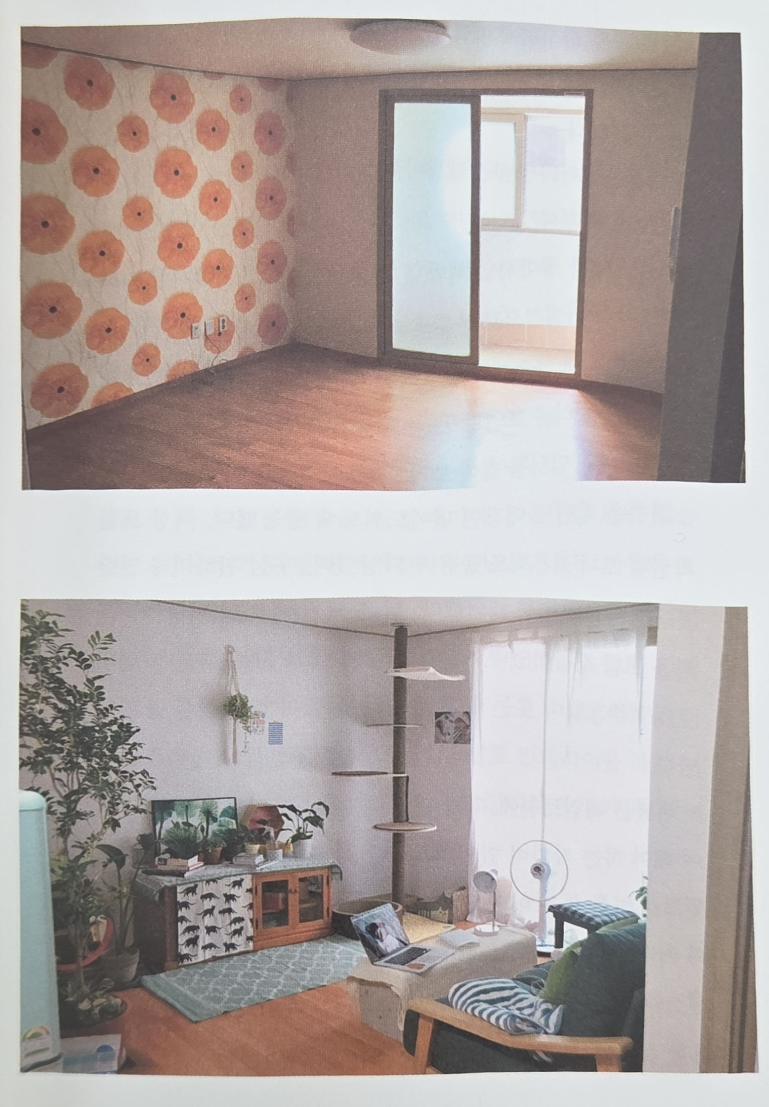 - 전 세입자가 빠져나간 집을 둘러보니 방 2개 모두 한쪽 벽에 곰팡이가 피어 있었다. 오래되어 누렇게 뜬 벽지도, 거실의 꽃무늬 벽지도 거슬렸다. 내 마음에 드는 집을 만들기 위해서는 가장 기본이 되는 벽지부터 바꿔야 했다. 곰팡이를 처리하기 위해 벽지를 뜯어내고 곰팡이 제거제와 방지제를 발랐다. 도배는 전문 업체에 맡겼다. 꽃무늬 벽지를 찝찝해하고 누런 얼룩을 볼 때마다 한숨을 쉬느니, 마음에 드는 공간에서 웃으며 사는 게 좋겠다고 판단했다. 내가 집을 예뻐해 주면 집은 나에게 더 큰 힘을 줄 거라고 믿었다.