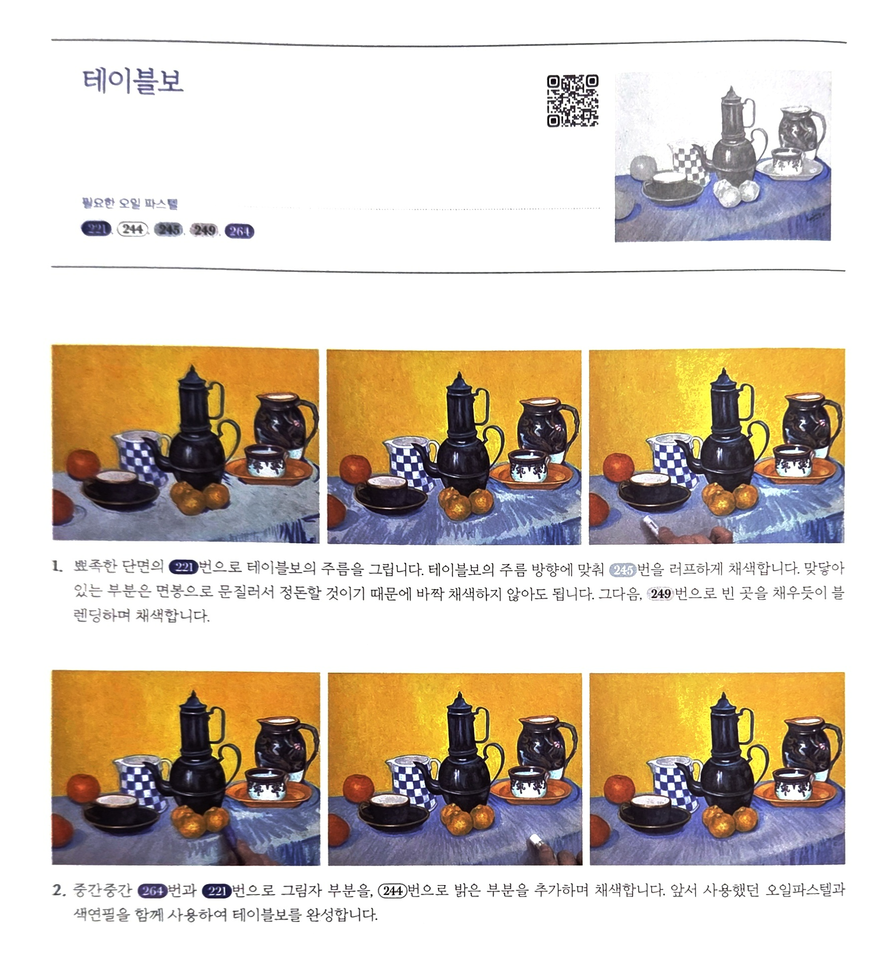 2. 중간중간 264번과 221번으로 그림자 부분을, 244번으로 밝은 부분을 추가하며 채색합니다. 앞서 사용했던 오일파스텔과 색연필을 함께 사용하여 테이블보를 완성합니다.
