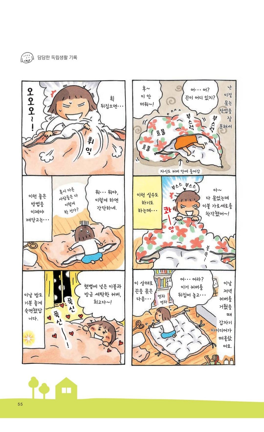 또 누구나 자기만의 소소한 생활팁들을 가지고 있다는 걸 다시금 느꼈는데, 이불 커버에서 나와 완전히 똑같은 경험을 한 것에 빵 터져서 캡쳐. 나도 처음엔 온갖 투덜거림을 달고 커버 안으로 기어들어가서 묶다가 이러라고 만들었을 리가 없다는 (당연한) 깨달음을 얻은 다음엔 밖에서 묶은 다음 뒤집는다. (아직도 종종 가로 세로는 실수한다)