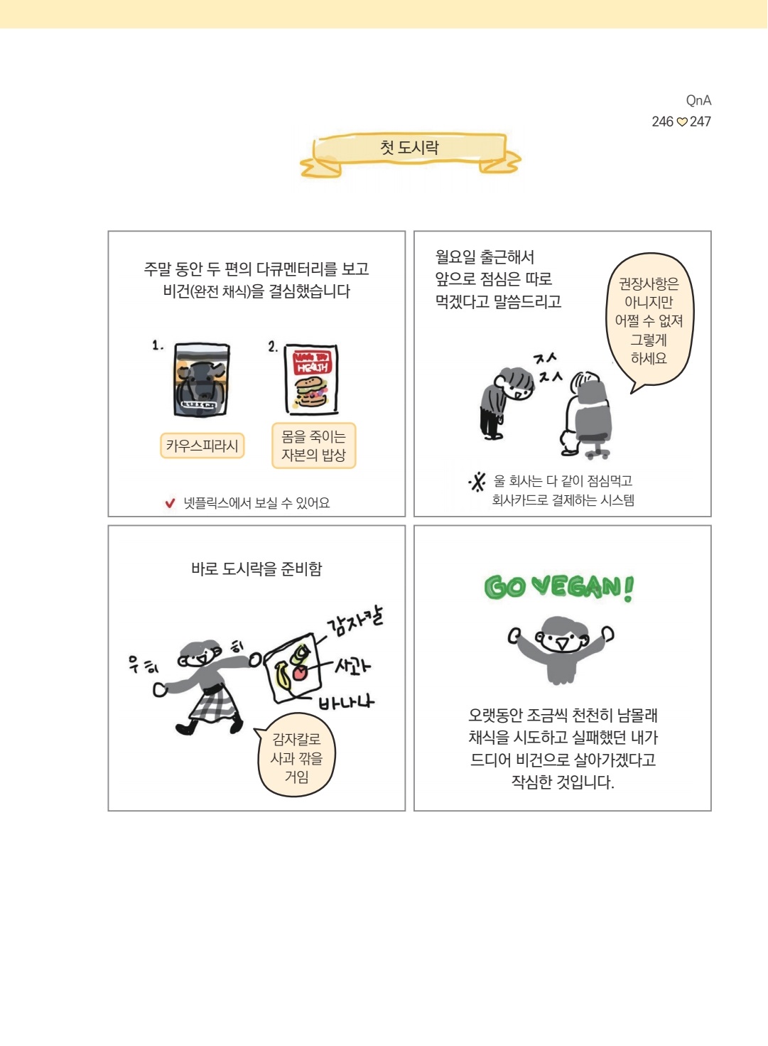 완전한 채식을 추구하기에는 여러모로 제약 사항이 많은 편인데 -일단 근무 중 식사 시간이 없다-